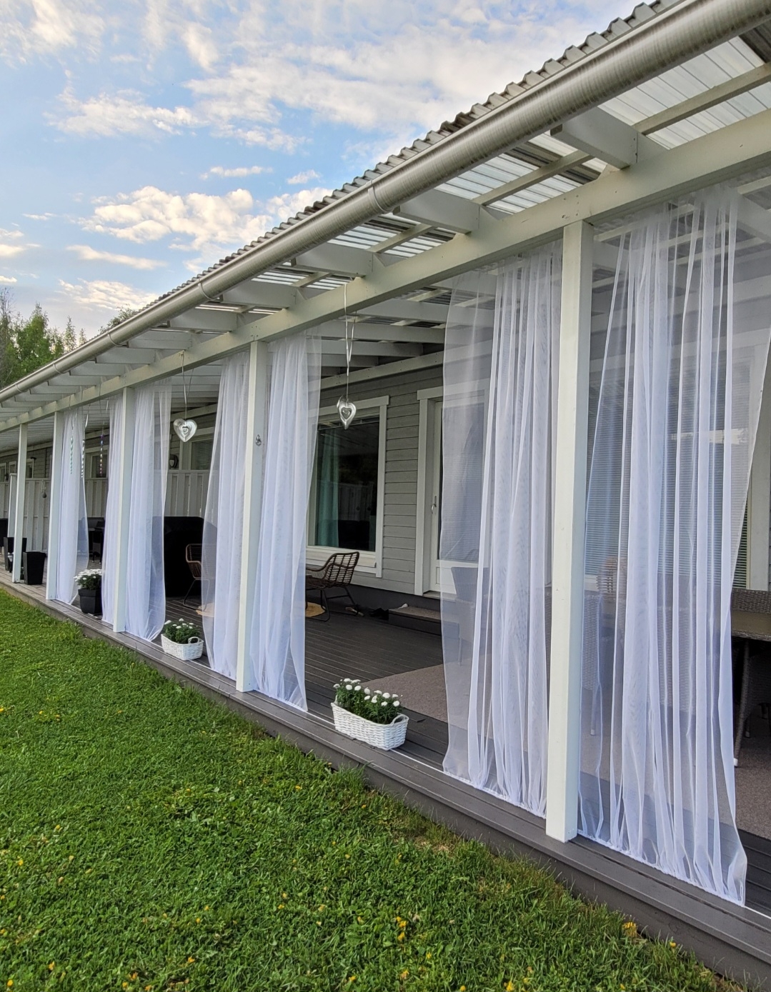 Halusin laittaa verhot, jotka antavat ehkä vähän suojaa auringolta kuin myös omaa rauhaa, vaikkakin täällä ihan rauhaisaa onkin...